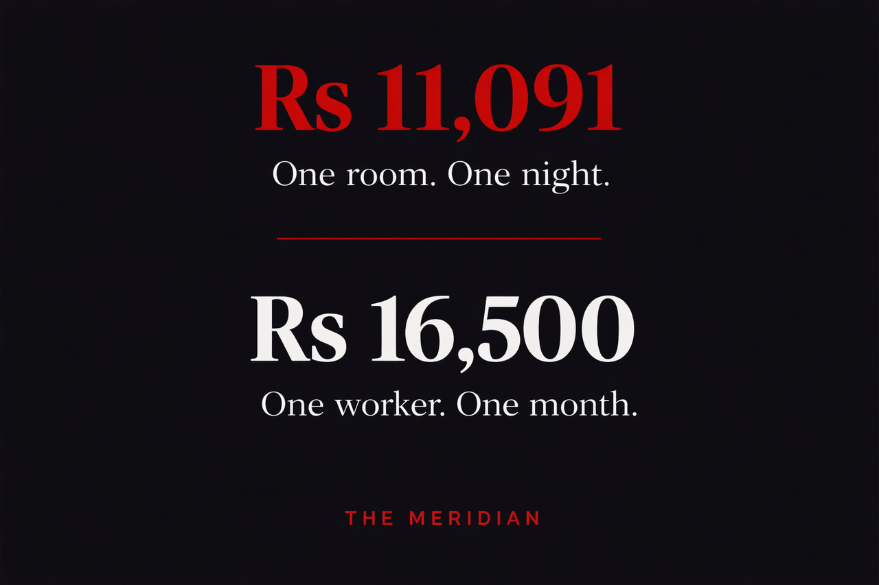 The room costs what the worker earns in a month. This is not a metaphor for inequality. It is a measured ratio produced by a functioning system. The weak rupee makes the room cheaper for the tourist and the wage worth less for the worker simultaneously. The minimum wage is set below survival and supplemented with public money so the hotel's statutory obligation remains internationally competitive. The taxpayer funds the supplement. The IMF audits the fiscal position and recommends cutting the supplement. The hotel's margin is never the subject of adjustment. The worker absorbs every layer of the architecture.